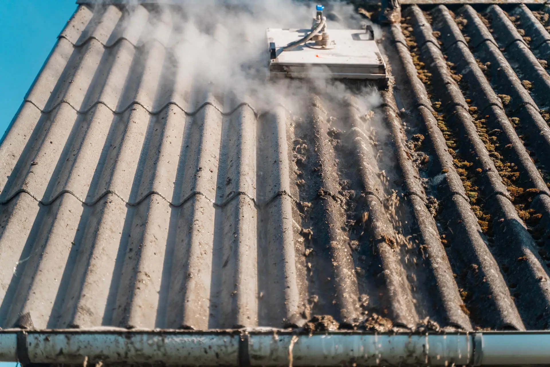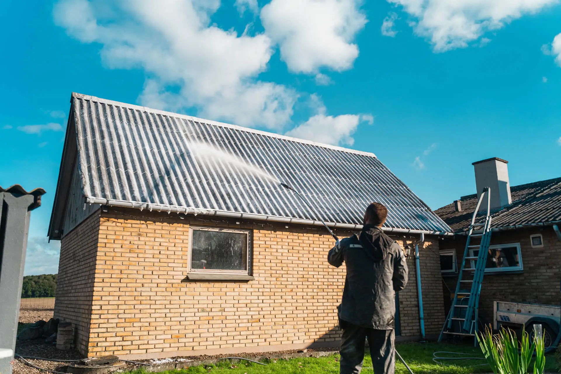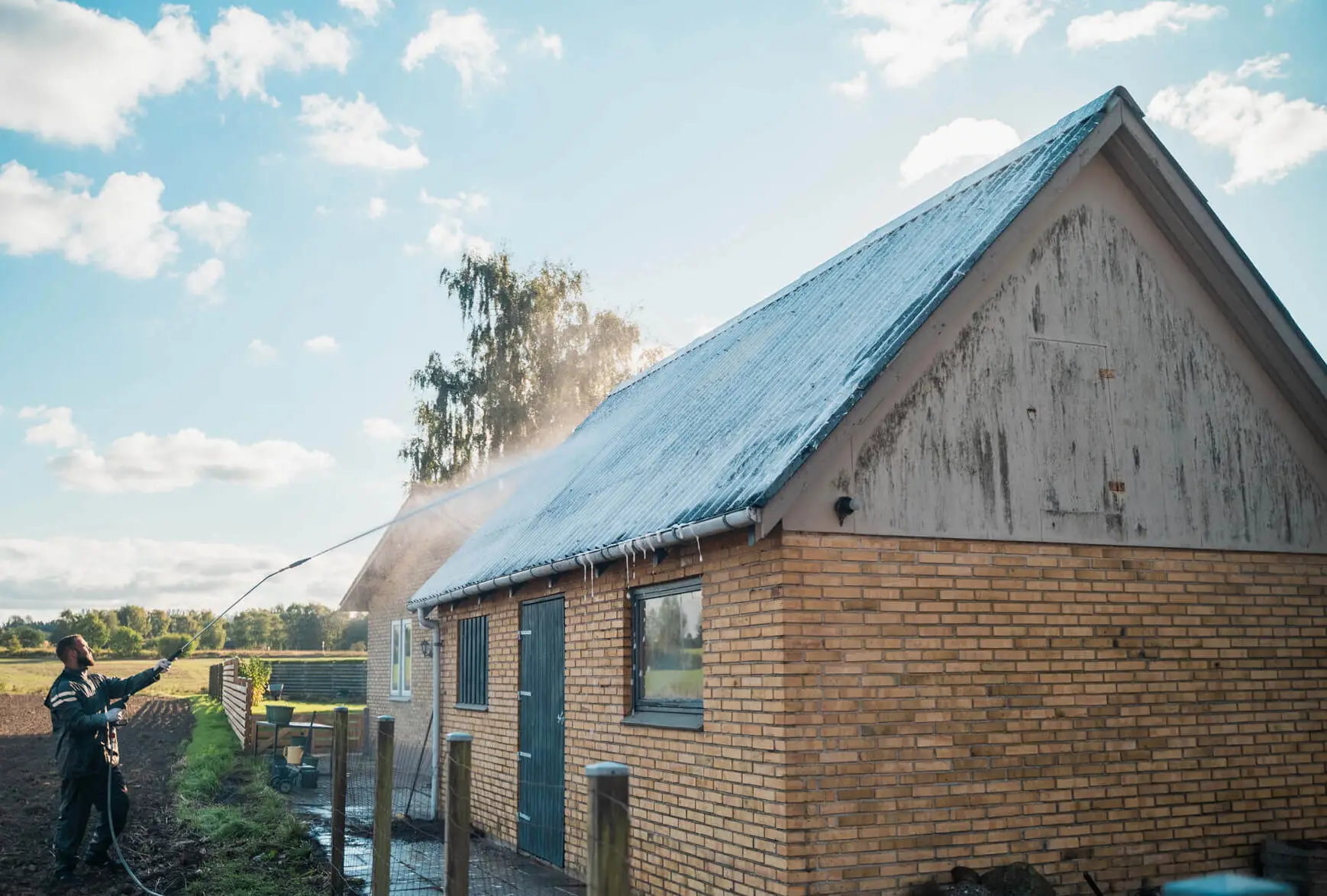 - Algebehandlingen af taget forgår fra jorden, hvor vi anvender en skumlanse, som sprøjter alge-middelet op på tagets overflade.